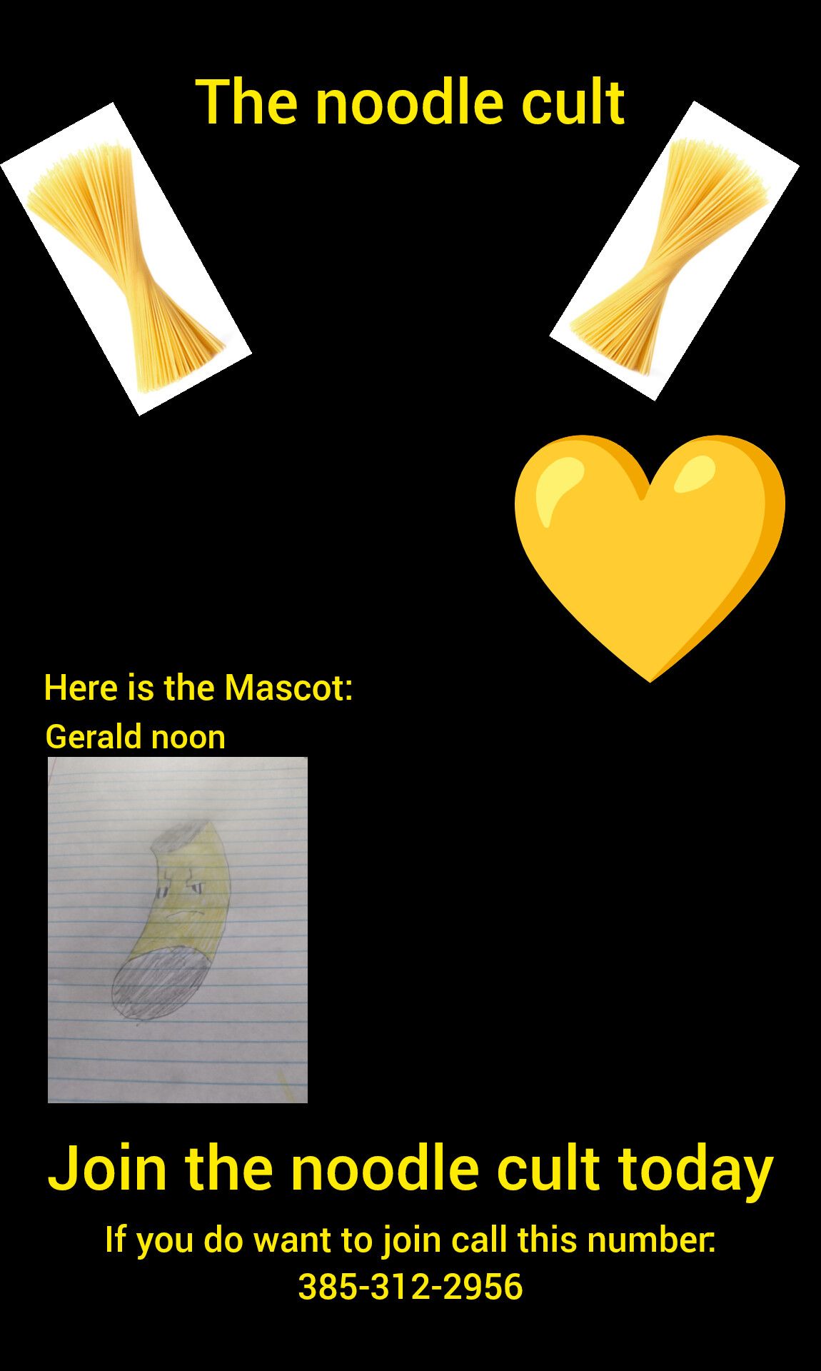 The image shows the text "The noodle cult", followed by two bundles of spaghetti and a heart. Below there is the text "Here is the Mascot: Gerald noon" followed by a drawing of a banana. At the bottom, there is the text "Join the noodle cult today. If you do want to join call this number: 385-312-2956."