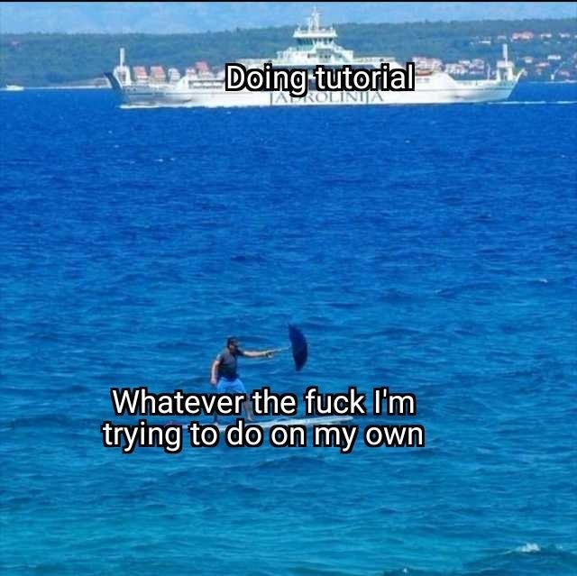 The image shows a split comparison. In the top half, a cruise ship is moving through calm water, and the text says, "Doing tutorial." In the bottom half, a person is struggling to stand on a paddleboard in the middle of the ocean, holding an umbrella for balance. The text above reads, "Whatever the fuck I'm trying to do on my own."