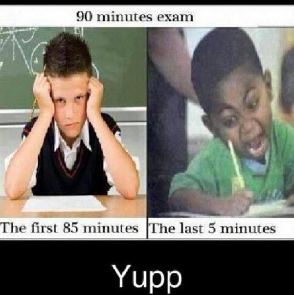 The meme shows a split image. The left side shows a boy with his hands on his face looking bored, and below the picture is written "The first 85 minutes". The right side shows a boy looking stressed and writing, and below that, it says "The last 5 minutes". Above both is "90 minutes exam". Below both images is "Yupp."