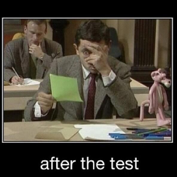 The image shows Mr. Bean sitting at a desk with his hand covering his eyes. He is holding a green piece of paper and there is another person sitting in the background. A pink panther toy is standing to the right. The text says 'after the test'.