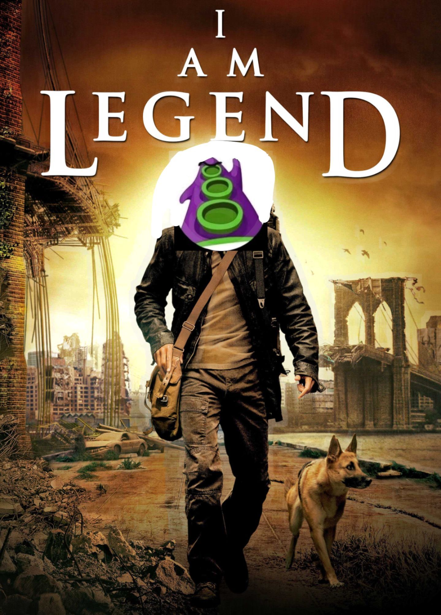 The image is a poster for the movie "I Am Legend", but the head of the main character is replaced by a purple squid with green eyes and suckers. The background shows a ruined city.