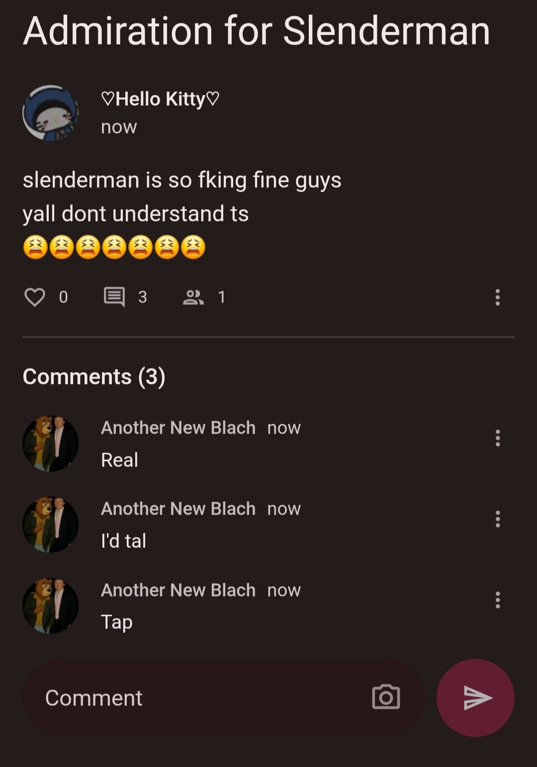 K!ttyy4 months agoslenderman is so fking fine guys yall dont understand ts 😫😫😫😫😫😫😫