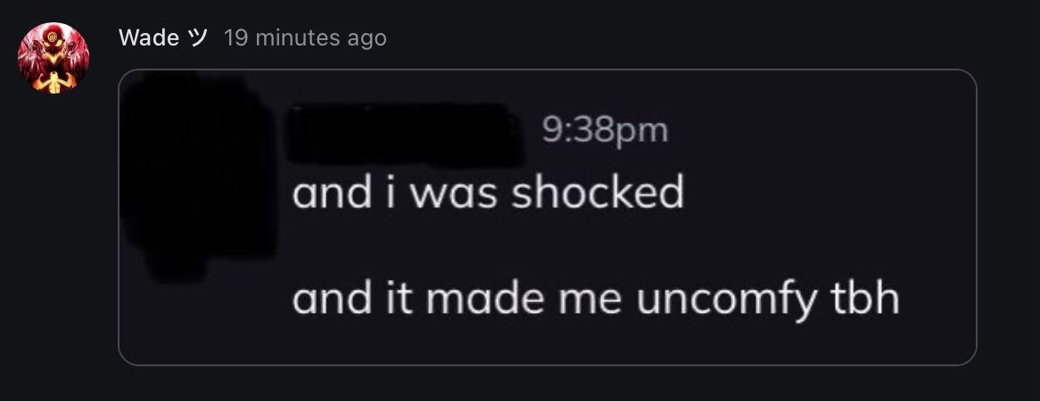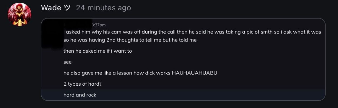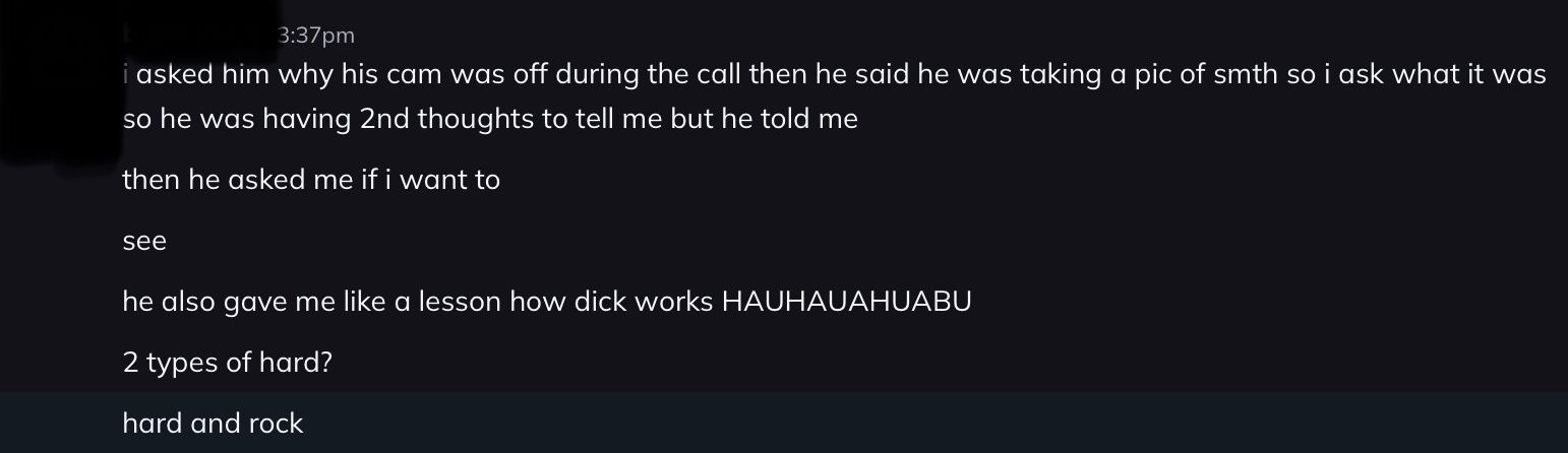 Nudes and dick showing and making someone uncomfortable to where she has to go and vent to her friends SECRETLY is definitely healthy bro, ur doing great…