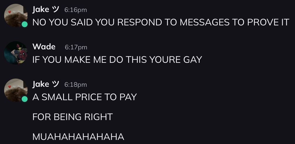 Wade2 years agoGuys Jake is asking me to respond to literally anyone I left on read one uwu and then screenshot it and send it to him
