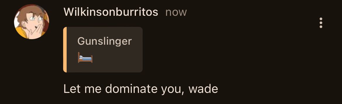 WWilkinsonburritos2 years agoεη°wilk is someone who is freaky when wade is aroundItβs not that bad