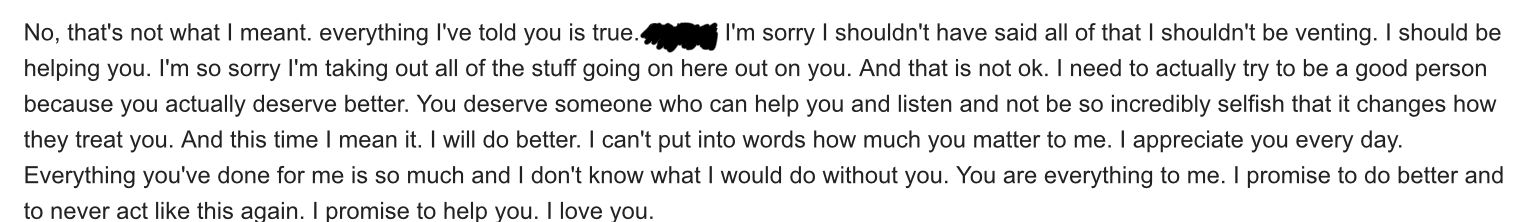 No, that’s not what I meant. Everything I told you is true. I’m sorry, I shouldn’t have said all that and I shouldn’t have been venting. I should’ve been listening and helping you. I’m sorry for taking out things that weren’t your fault on you. It wasn’t ok, I need to show changes and improvement in my behavior and actions instead of just saying I’ll change because you deserve so much better than excuses. I’ve been selfish and you don’t deserve that. I will do better, I cant express how much you mean to me. I appreciate you so much and everything you’ve done for me and I don’t know what I would do without you, so I’m not going to push you away or fuck this up. I will do better, I promise, and I’m sorry for what I did, it was unacceptable.