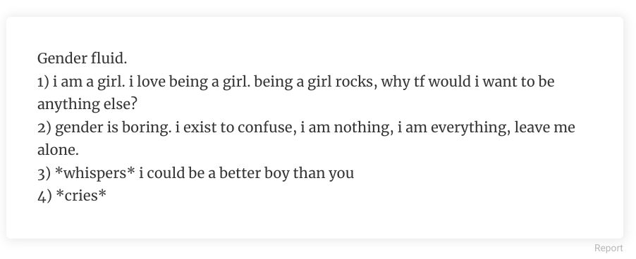 All of the people on this post: https://www.boredpanda.com/hey-pandas-whats-something-people-dont-understand-about-your-gender-identity/ are fuckin retarded.