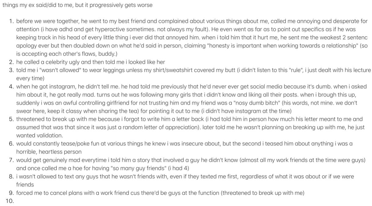 mal4 days agoim making a list rn cus i saw a reel of this girl listing things her ex did but it progressively got worse and i thought itd be funny to do that
