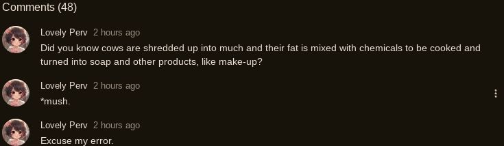 The Ghoul1 year agoThat is the funniest most bullshitted reason I’ve seen for someone to cry, like the damn Vegan Teacher or some shit