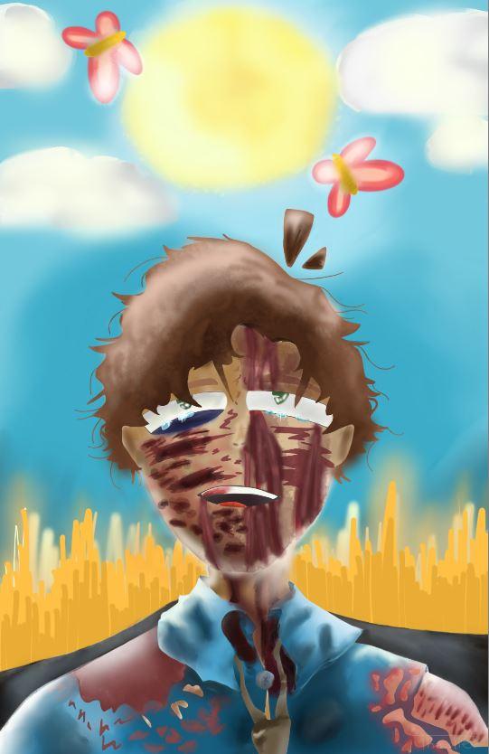 He looks like, he survived a horrible night, like in a horror movie