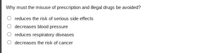 Seriously? That question is for toddlers. Misuse means you get the serious side effects, obviously. Avoiding misuse *reduces the risk* of those pathetic side effects. So the first one is the only BASED answer. If you can't figure that out, you should stick to kindergarten puzzles. Next time, just assume the answer that covers the most ways you can screw up.
