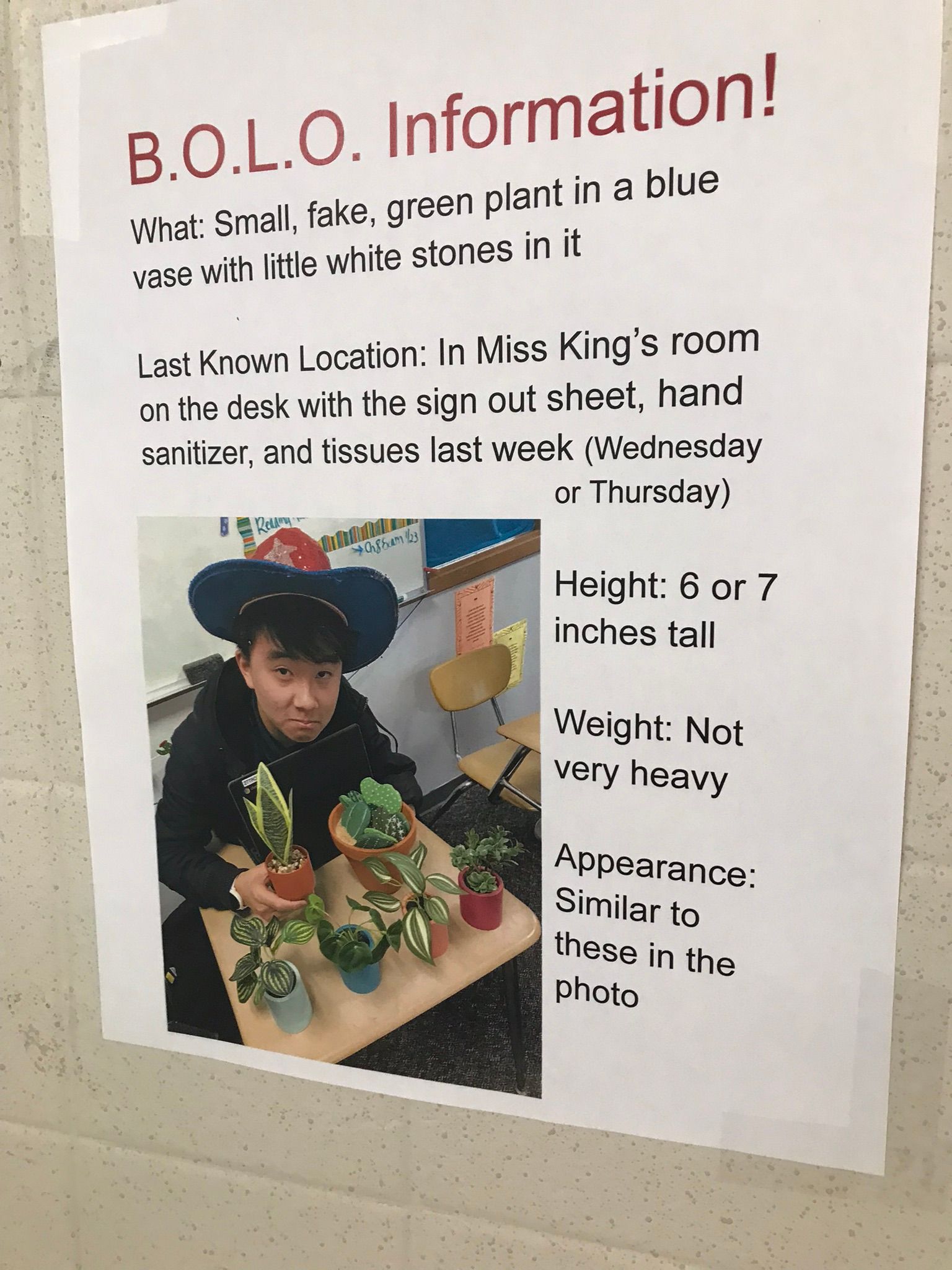 I was the one who stole the fake plant from SeΓ±orita Kingβs table where the hand sanitizer and sign out sheet was in front of the door. No one asked but I did it x