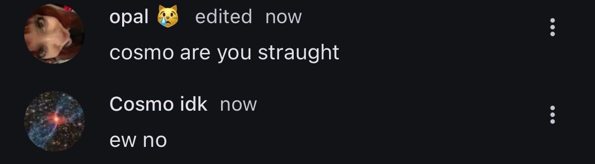 opal 😿3 hours agoCosmo idkyeah so the kid ethan is a bit of a retard and kinda tried to jack off a dog one timewhenever i hear the name ethan i get ptsd flashbacks