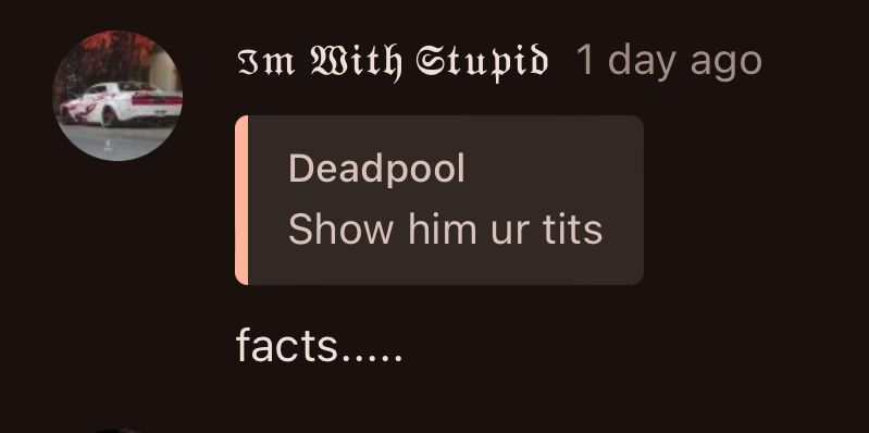 The Unknown King of Moderation1 year agoAnonymousJake you'd get pissed if someone did what u doinWHICH IS EXACTLY WHY IM DOING IT