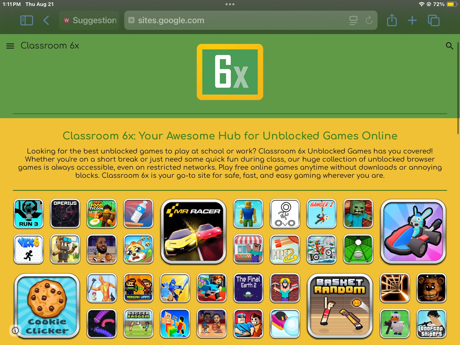 if you want to try them, you’ll have to search up classroom6x as class room 6x, and unblockedgamesg+ you’ll need to search it up and click on one of the game links if they’re blocked at your school