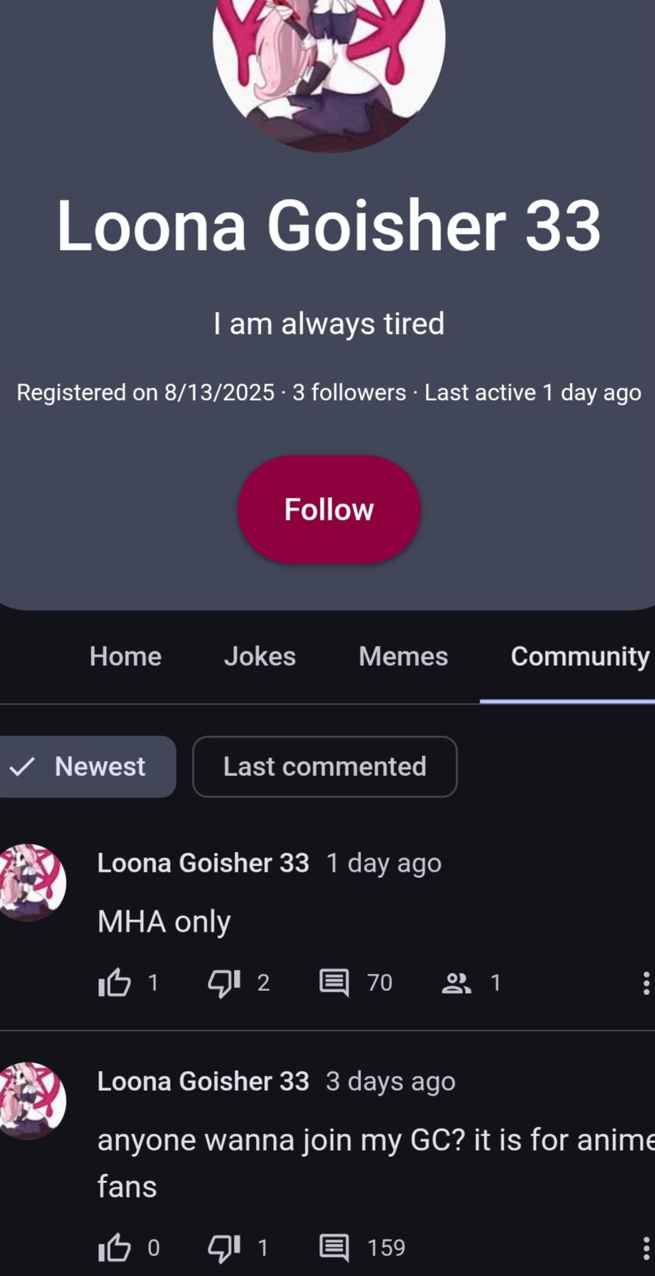Reasons: The "Anime" Alts For a good few weeks now, the site has been picking up a number of new members. except it hasn't been. If you imagine it as a Venn diagram, a number of these accounts have been made in August,when you look at the date, each account has been made with on the 8/something and for a site like this is unlikely we'd get that many community users within a short ammout of time (this is the first circle) The other accounts have been made with very obvious ties to the anime community, mainly MHA (pfp, bios, convo topics and posts, even memes) (this would be the second circle) and in the middle you have a cross, between the 8/s and the animes. Most of these accounts are in the middle part, being both that of 8/s and Animes