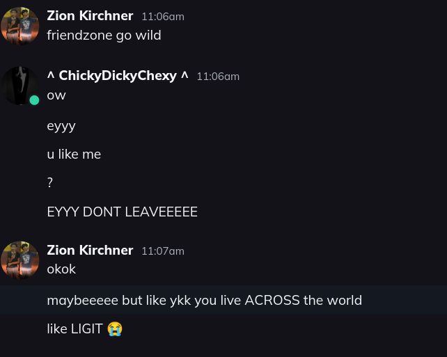 besides i think zion doesnt like me like seriously bc idk