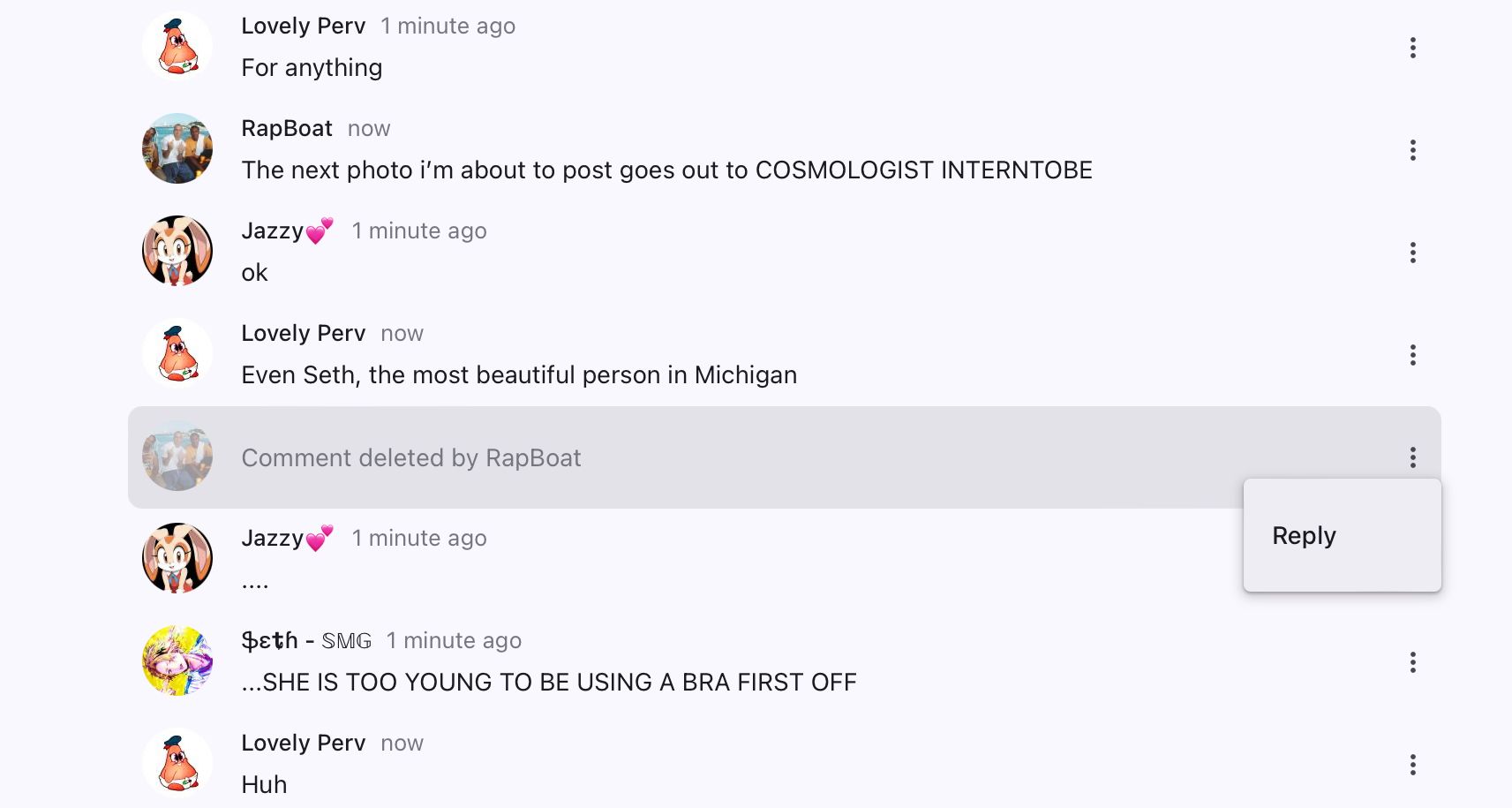RapBoat1 year agoJazzyπno bitch I'ma kill you what Seth does it love but what I do is end ppl with no fucking remorseNot gonna cap, that sounds like a RAP LYRIC