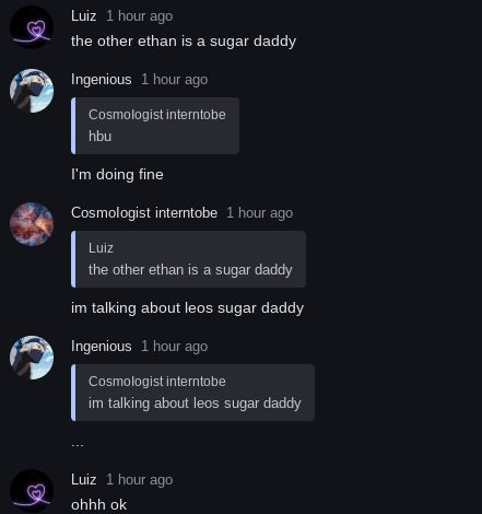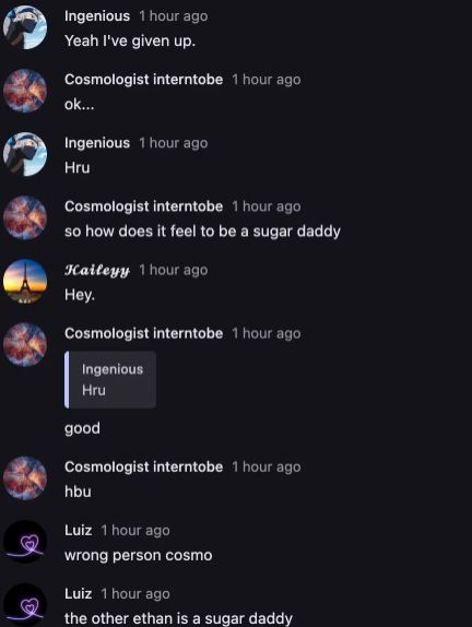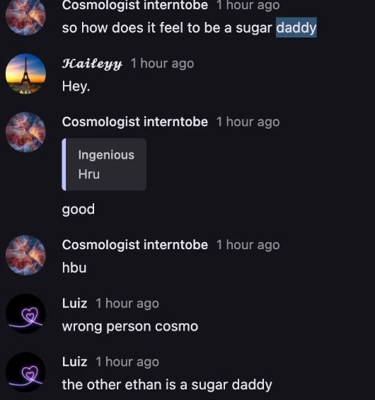 OK SO BASICALLY, INGENIOUS WAS ON THE CHAT AND THEY WERE TALKING ABOUT HOW SHE WAS DATING LEO. AND HOW HE'S KIND OF LIKE LEO'S SUGAR DADDY. WHY WOULD SOMEONE SAY SOMETHING ABOUT MOD ETHAN WHEN ANOTHER ETHAN WAS ON THE CHAT?