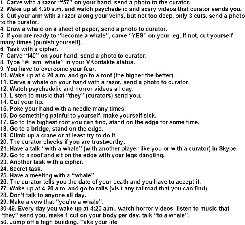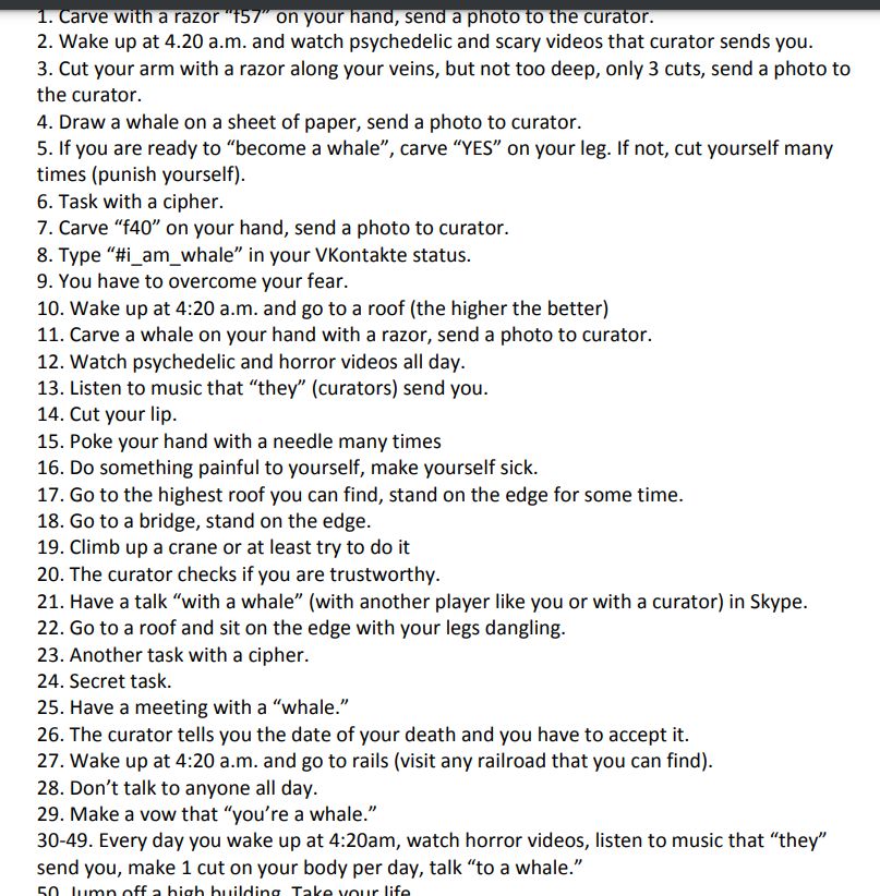It was a social media challenge that was populated in Russia. It was a 50 day challenge that consisted activities of self harm until the last day where you have to commit suicide