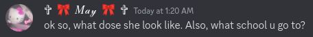 and she was staring down some girl in her math class and was just like "are you straight" and the girl was like "Yes?" and she was like "darn" like wtf