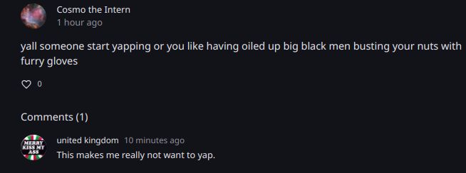 Cosmo idk1 year agoyall someone start yapping or you like having oiled up big black men busting your nuts with furry gloves