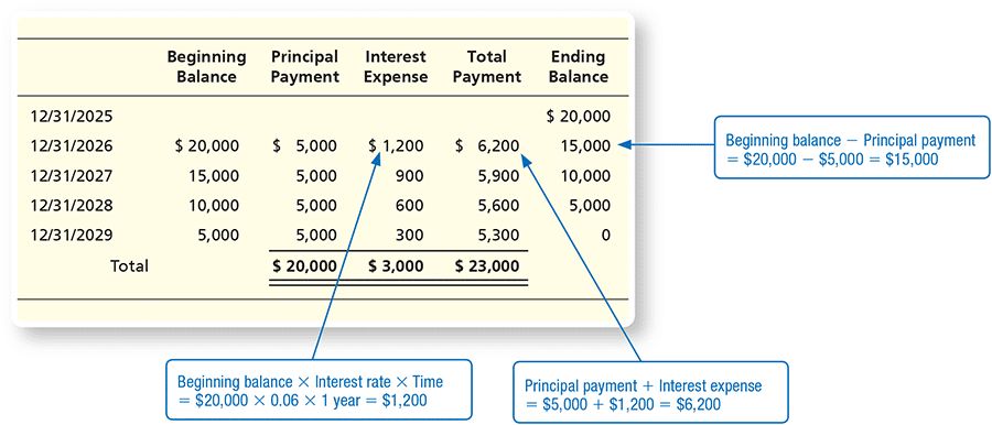 Assume it’s now December 31, 2026, and Smart Touch Learning must make its first installment payment of $5,000 principal plus interest on the note. The company’s accounting clerk will record the following entry: