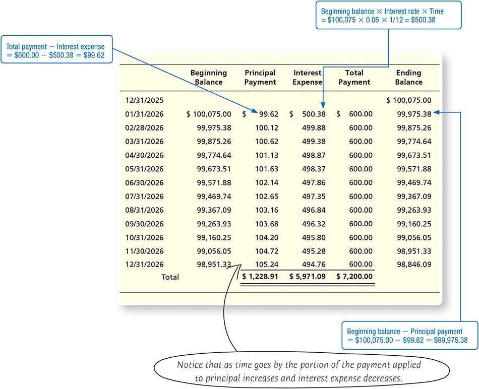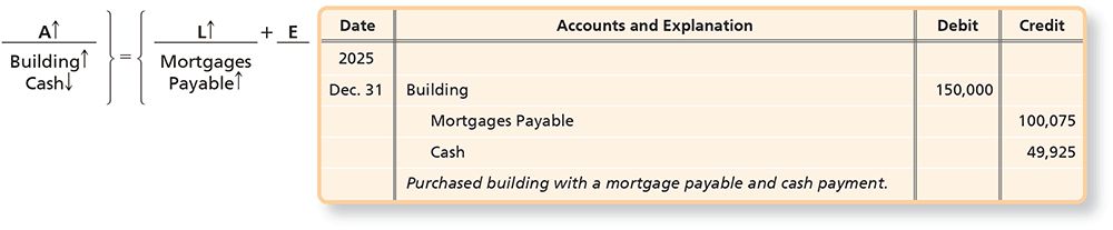 Mortgages PayableMortgages payable include the borrower’s promise to transfer the legal title to specific assets if the mortgage isn’t paid on schedule. Mortgages payable are a type of long-term notes payable that are secured with specific assets. Like long-term notes payable, the total mortgages payable amount has a portion due within one year (current) and a portion that is due more than one year from the balance sheet date.F:12-4Commonly, mortgages specify a monthly payment of principal and interest to the lender (usually a bank). The most common type of mortgage is on property—for example, a mortgage on your home. Let’s review an example.Assume that on December 31, 2025, Smart Touch Learning purchases a building for $150,000, paying $49,925 in cash and signing a 30-year mortgage for $100,075, taken out at 6% interest that is payable in $600 monthly payments, which includes principal and interest, beginning January 31, 2026. The following entry is used to record this acquisition: