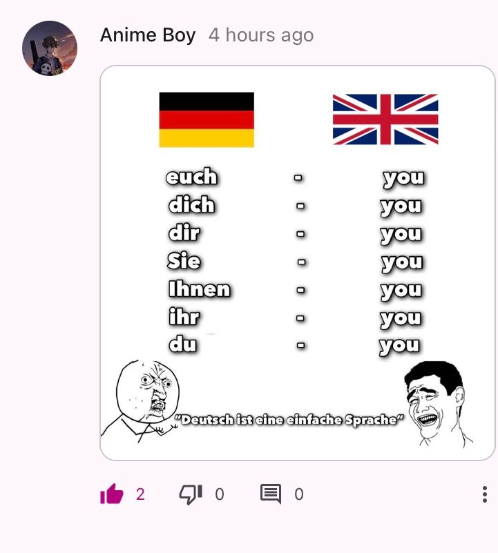 Good Morning! I read on the German site that you shouldn't come here anymore to avoid unnecessary stress and because most people there would be broader and stupid. I will still continue to chat with you here, firstly because you are anything but what was said and secondly because we are undisturbed here in your meme :)
